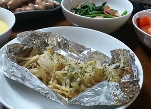 晩ごはん献立 シャケのホイル焼きとイカの燻製入ポテサラ お得なパックは私がいただく 節約ごはん 日常 ときどき三兄弟